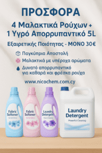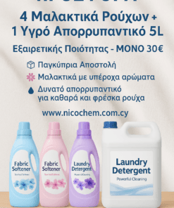 Εκμεταλλευτείτε την προσφορά 30€ με 4 μαλακτικά 5 λίτρων και 1 υγρό απορρυπαντικό 5 λίτρων υψηλής ποιότητας. Ιδανικά για σπίτι & επαγγελματική χρήση. Περιορισμένο απόθεμα!
